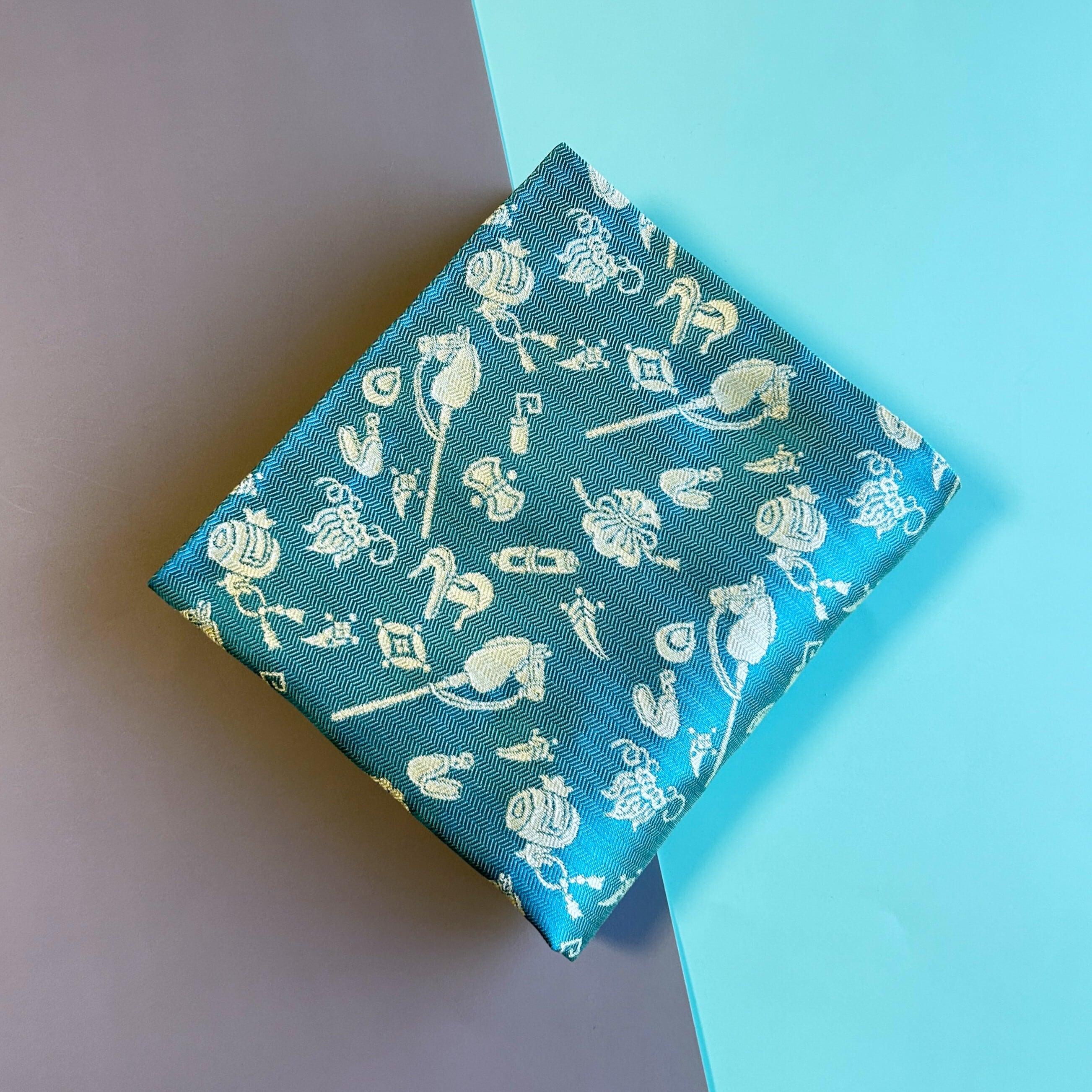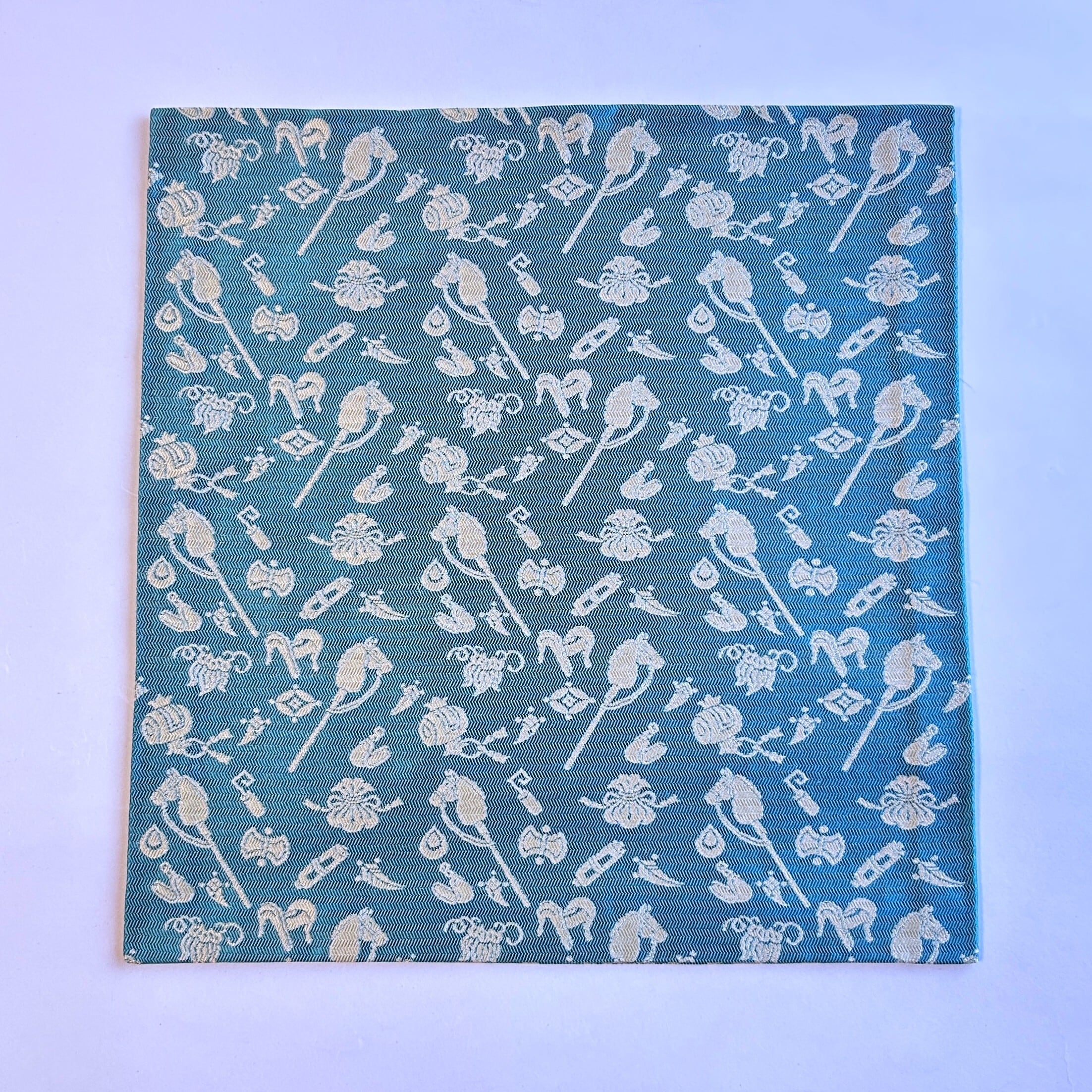 文様は、春駒と呼ばれる玩具を参考に、鐙(あぶみ)や鞍と吉祥文様の宝尽しを配しています。春駒と呼ばれる玩具は棒馬とも呼ばれ、中世ヨーロッパをはじめ世界に似た玩具が広く普及していたと思われます。打ち出の小槌・金嚢・隠れ蓑・宝巻・七宝・鍵・分銅・宝珠・丁子などの宝尽し文様と共に配し、柔らかな風合いが特徴の紹巴組織で織り出されています。