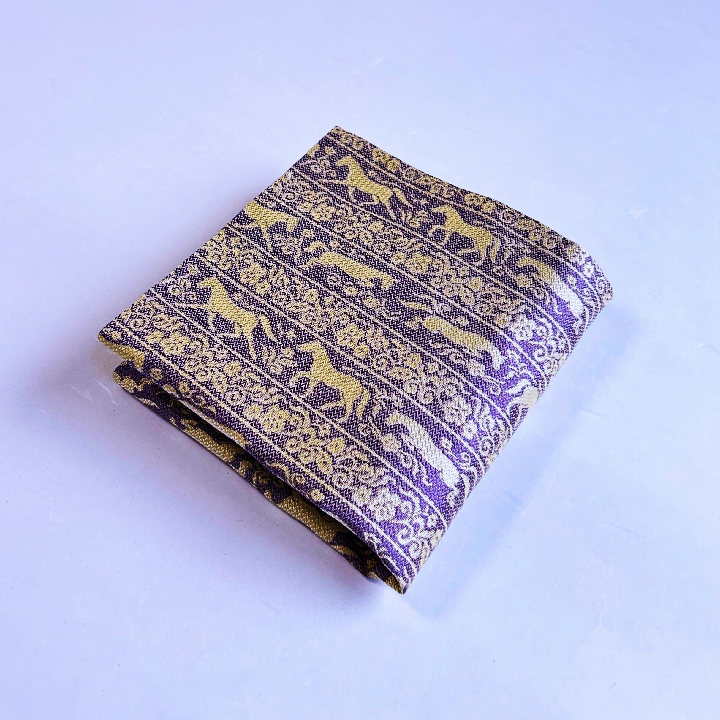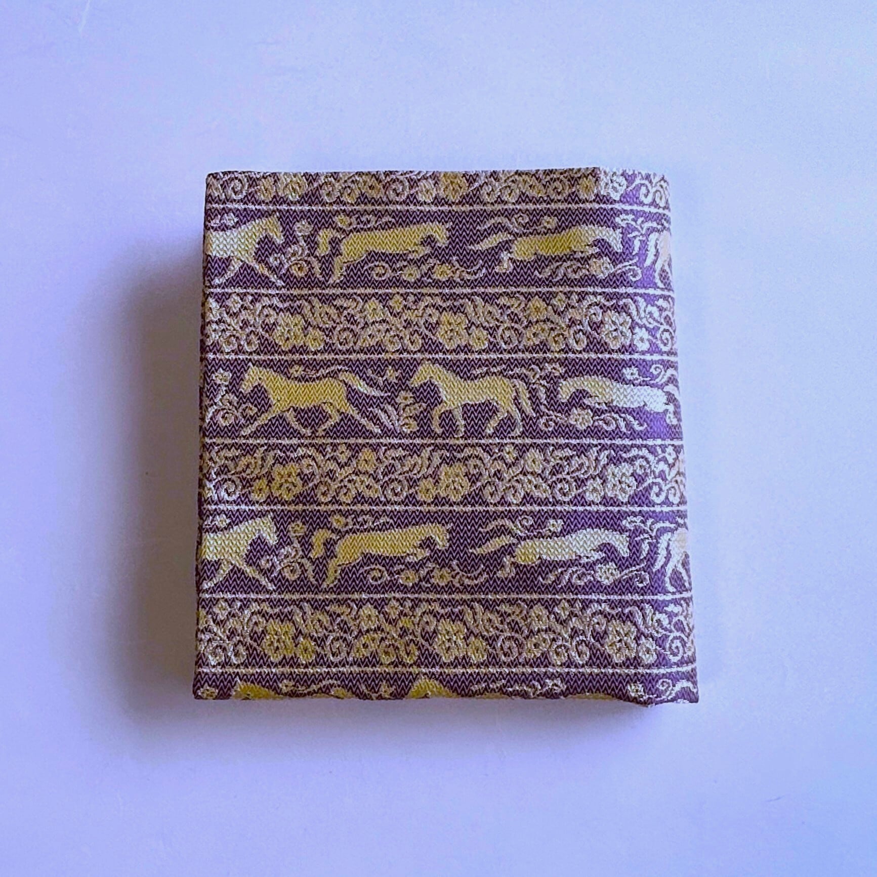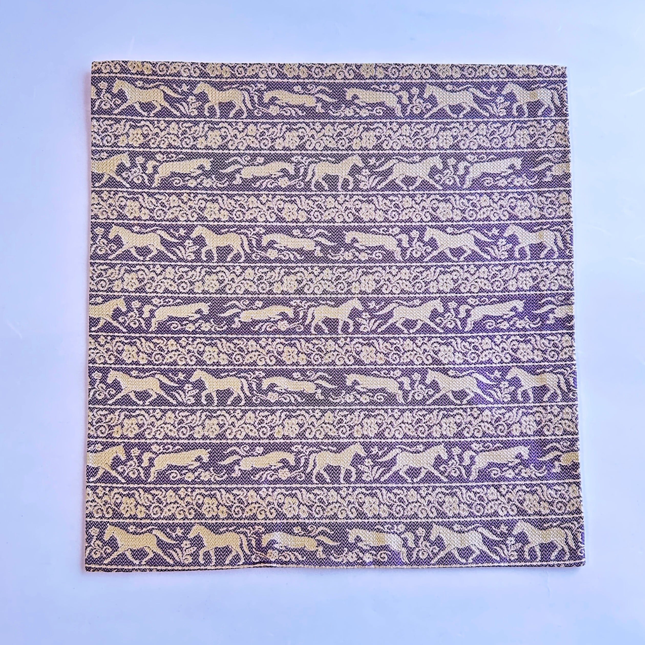 馬は古来より人との関係が密接で、神社では絵馬が奉納されるなど大切にされてきました。文様は美しく躍動する数種の馬を段にあらわし、間の段に花唐草文様を配した構成です。流麗に走る馬の姿を柔らかな風合いが特徴の、変則の紹巴組織で織り出しています。