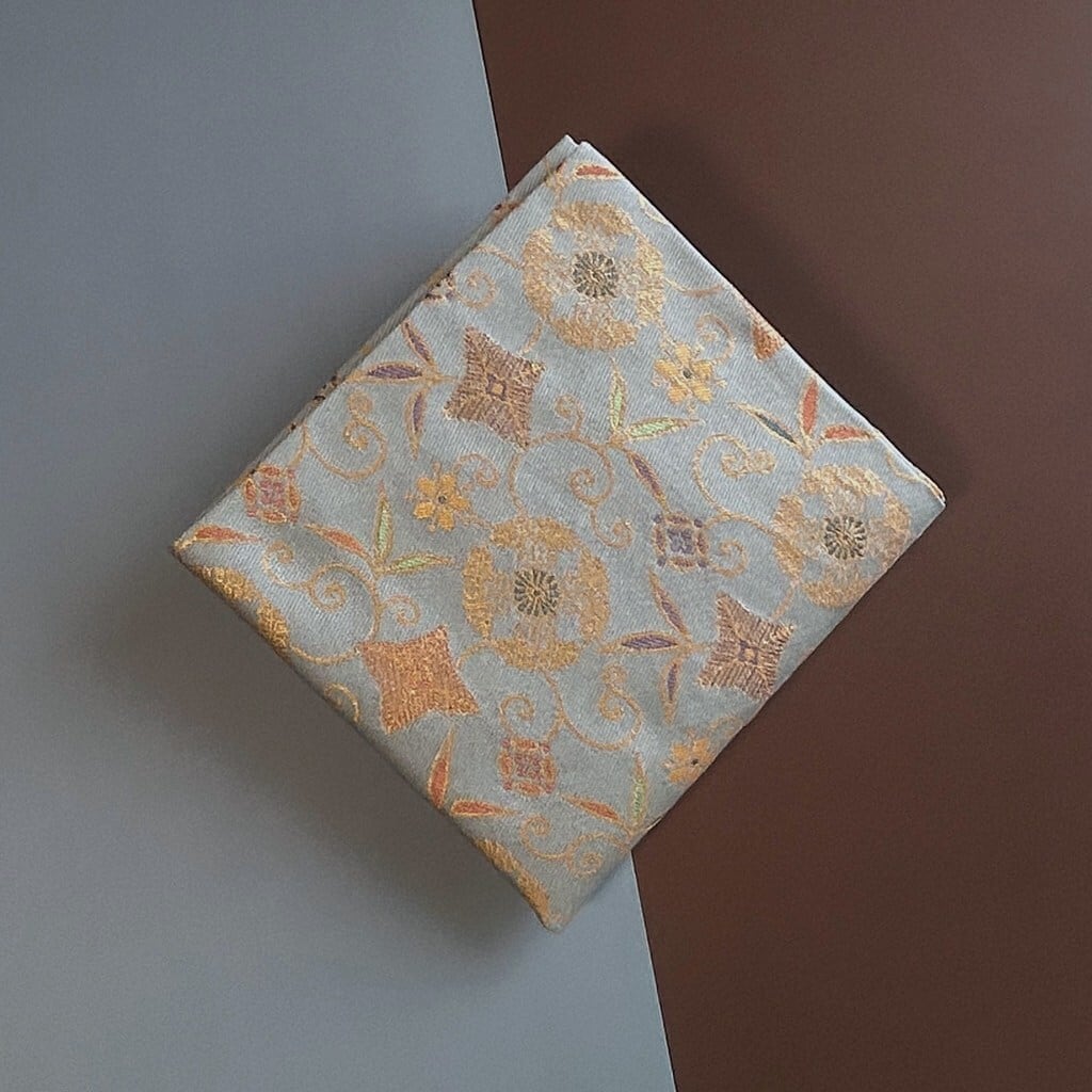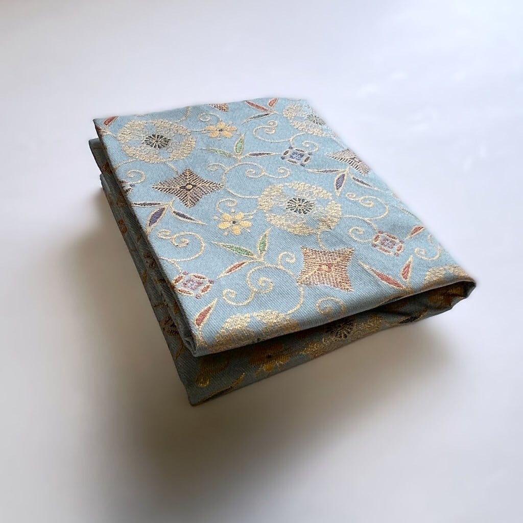文様は藤の花を円形にデザインした藤丸文様を、笹の細蔓に菱型の松毬と五弁の小花をつけた笹蔓文様と共に配した構成です。藤の花は初夏に淡紫色や白色の房状の花をつけ平安時代には藤の花の宴が盛んに行われました。藤丸文様と変形の笹蔓文様を組み合わせた意匠が美しい裂です。青みがかったグレーの灰青色で織り出しています。