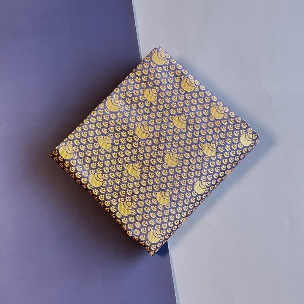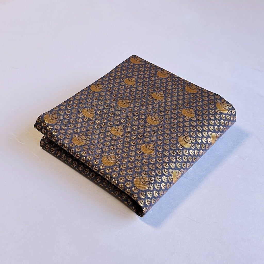 宝珠文様は宝物とすべき珠文様で、形は丸く先が尖り火炎が燃え上がる状態です。吉祥の意味がある宝珠文様を織り出した重厚な趣ある金襴です。灰がかった紫紺色になります。