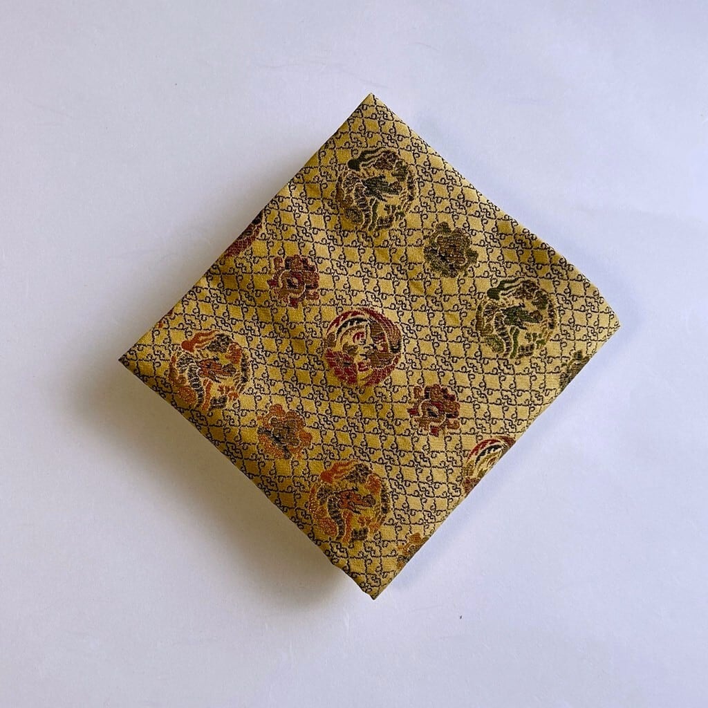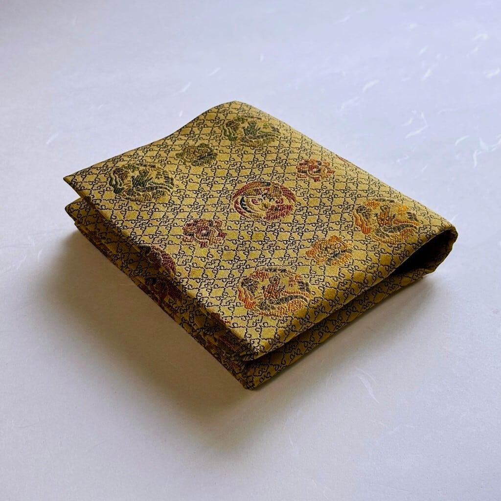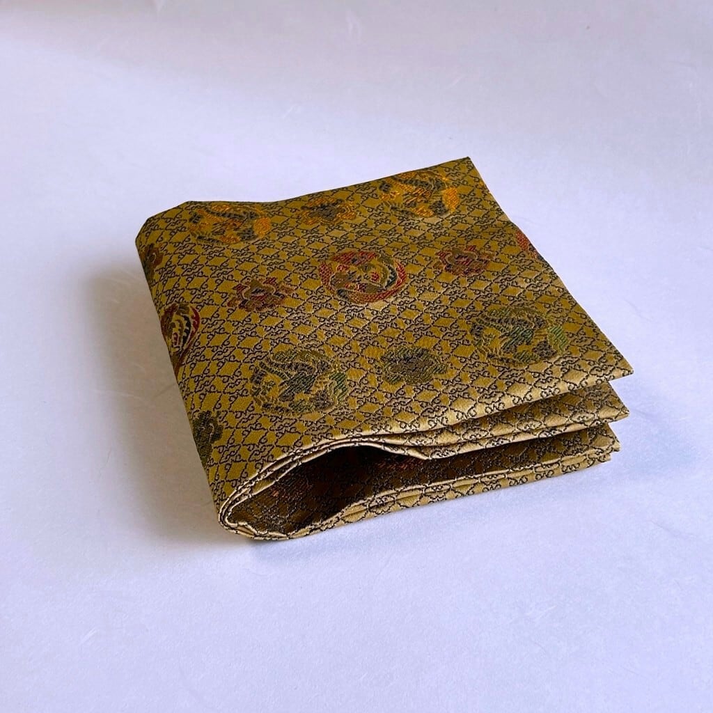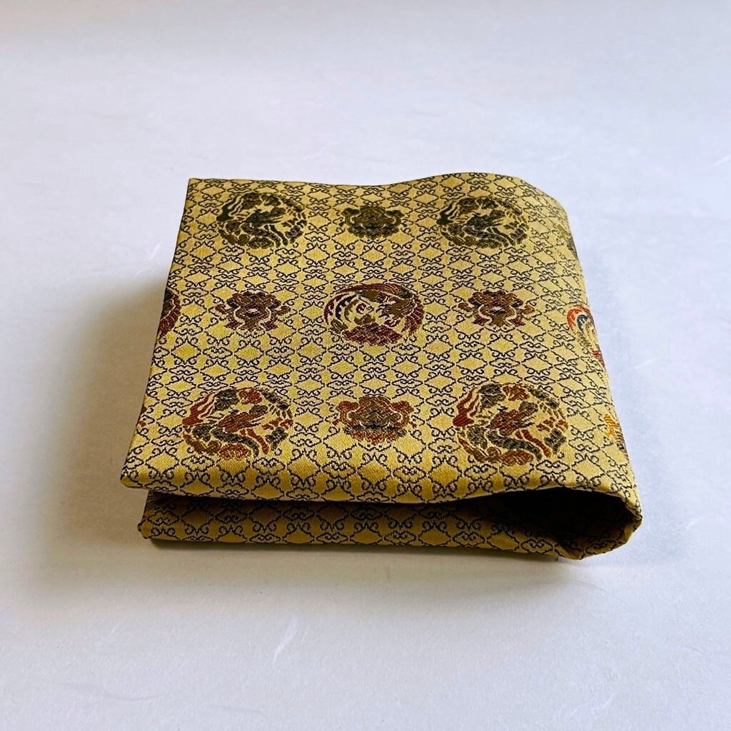 文様は、瑞祥の意味がある雲文様を菱形に構成し、その上に中国で四霊といわれる龍文様と鳳凰文様をあらわしています。見る角度により織り込まれた金箔が浮き出て、文様に重厚な趣を与えています。やや赤みを帯びたくすんだ黄茶色の木蘭(もくらん)色地です。