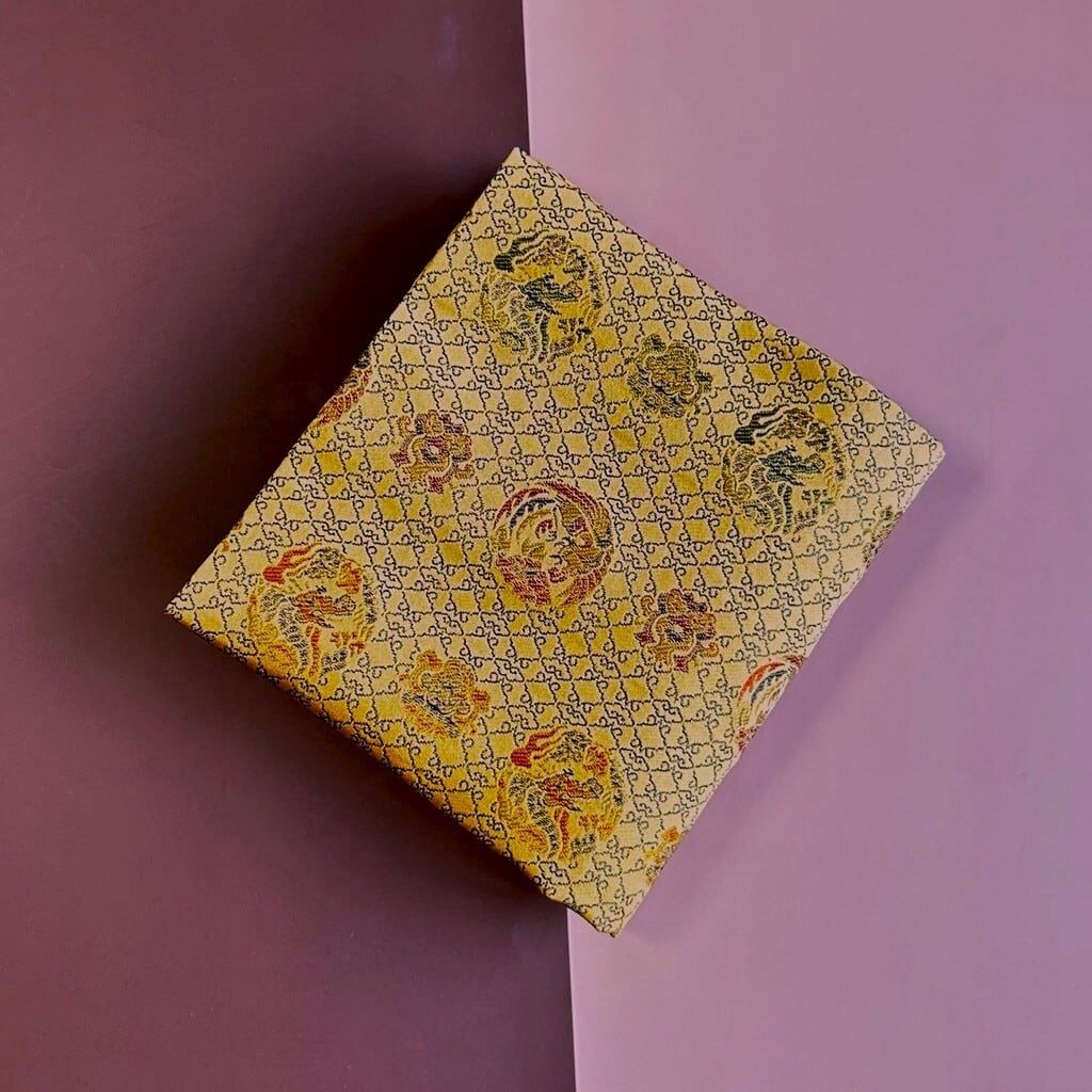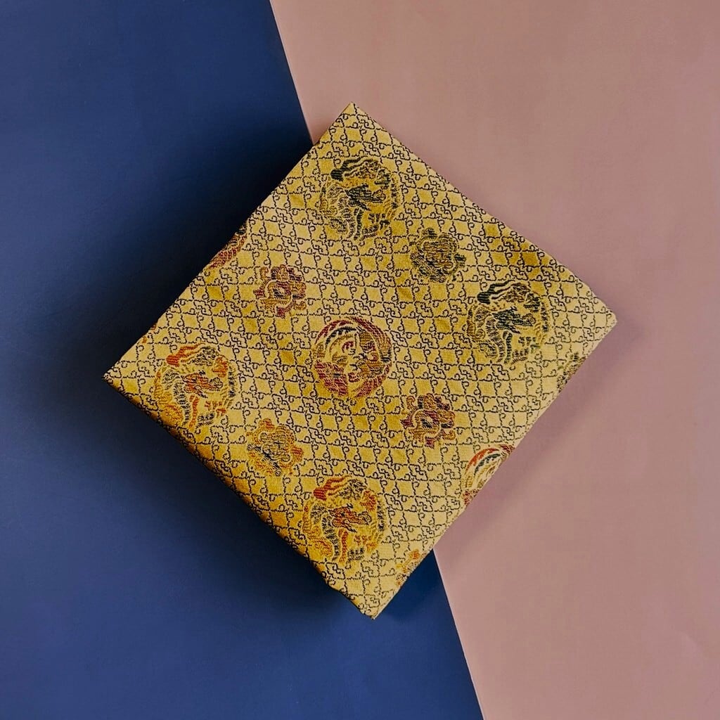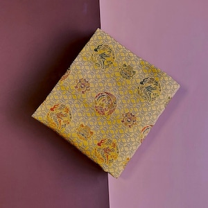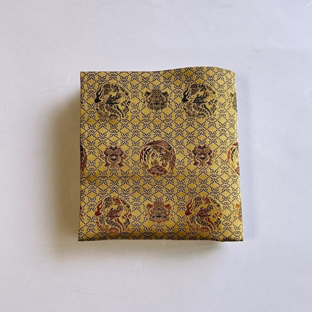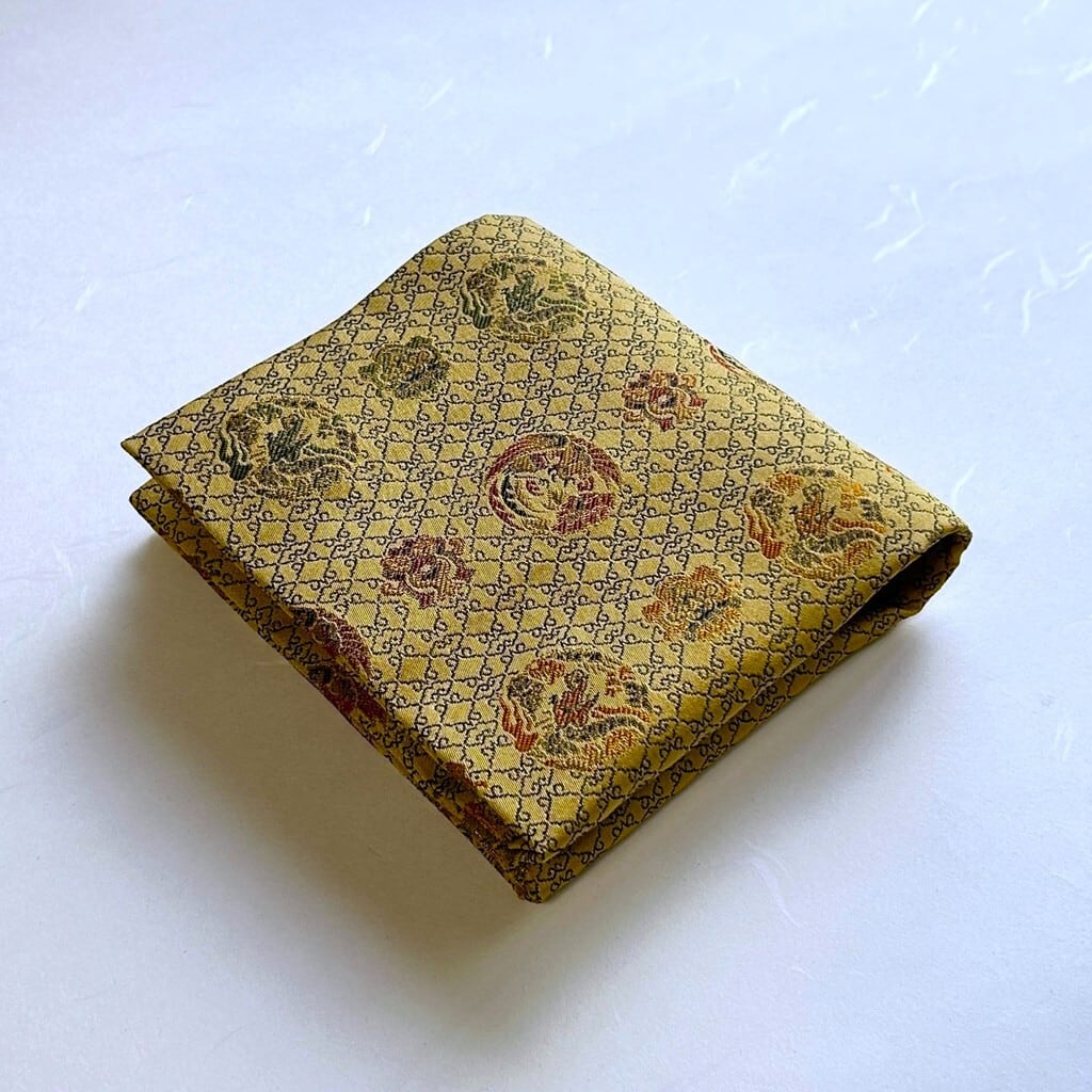 文様は、瑞祥の意味がある雲文様を菱形に構成し、その上に中国で四霊といわれる龍文様と鳳凰文様をあらわしています。見る角度により織り込まれた金箔が浮き出て、文様に重厚な趣を与えています。やや赤みを帯びたくすんだ黄茶色の木蘭(もくらん)色地です。