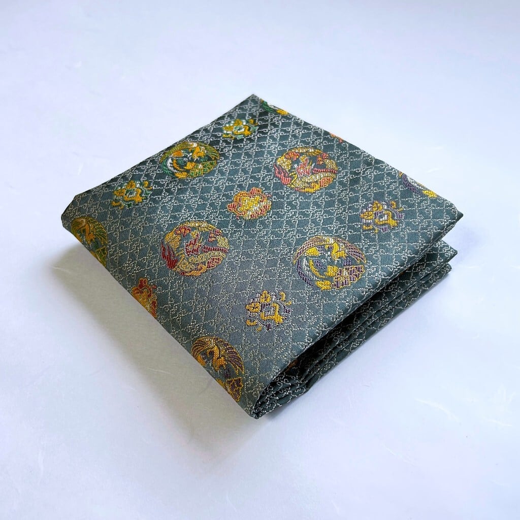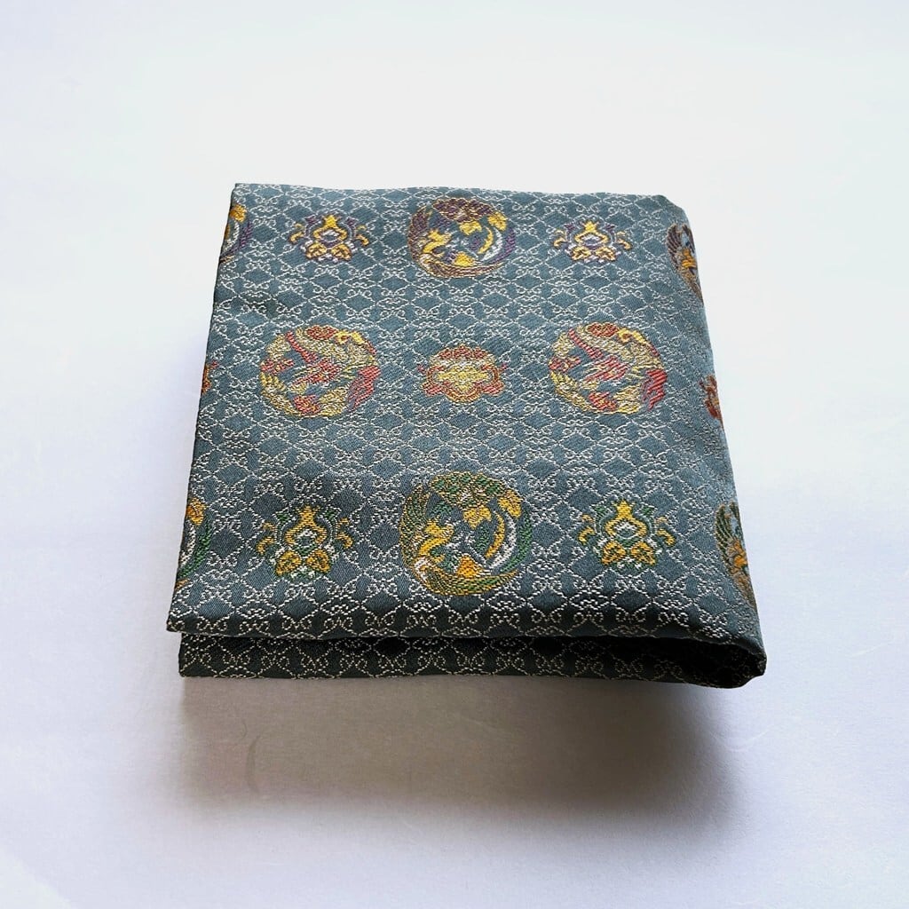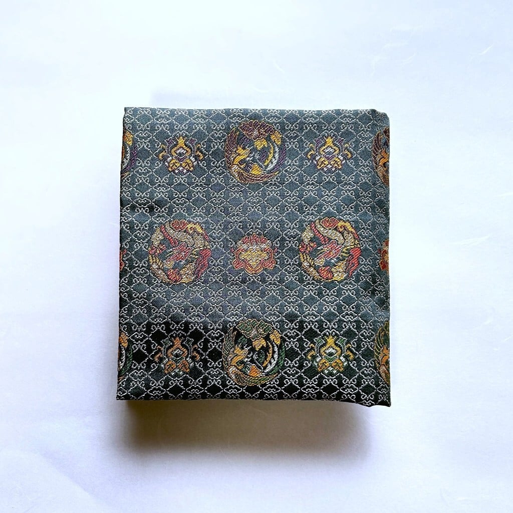 文様は、瑞祥の意味がある雲文様を菱形に構成し、その上に中国で四霊といわれる龍文様と鳳凰文様をあらわしています。見る角度により織り込まれた金箔が浮き出て、文様に重厚な趣を与えています。青みを帯びたグレーで落ち着いた灰青色地です。