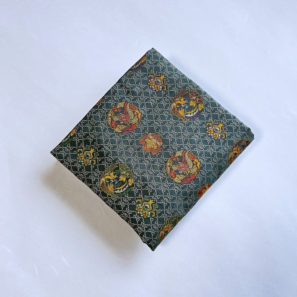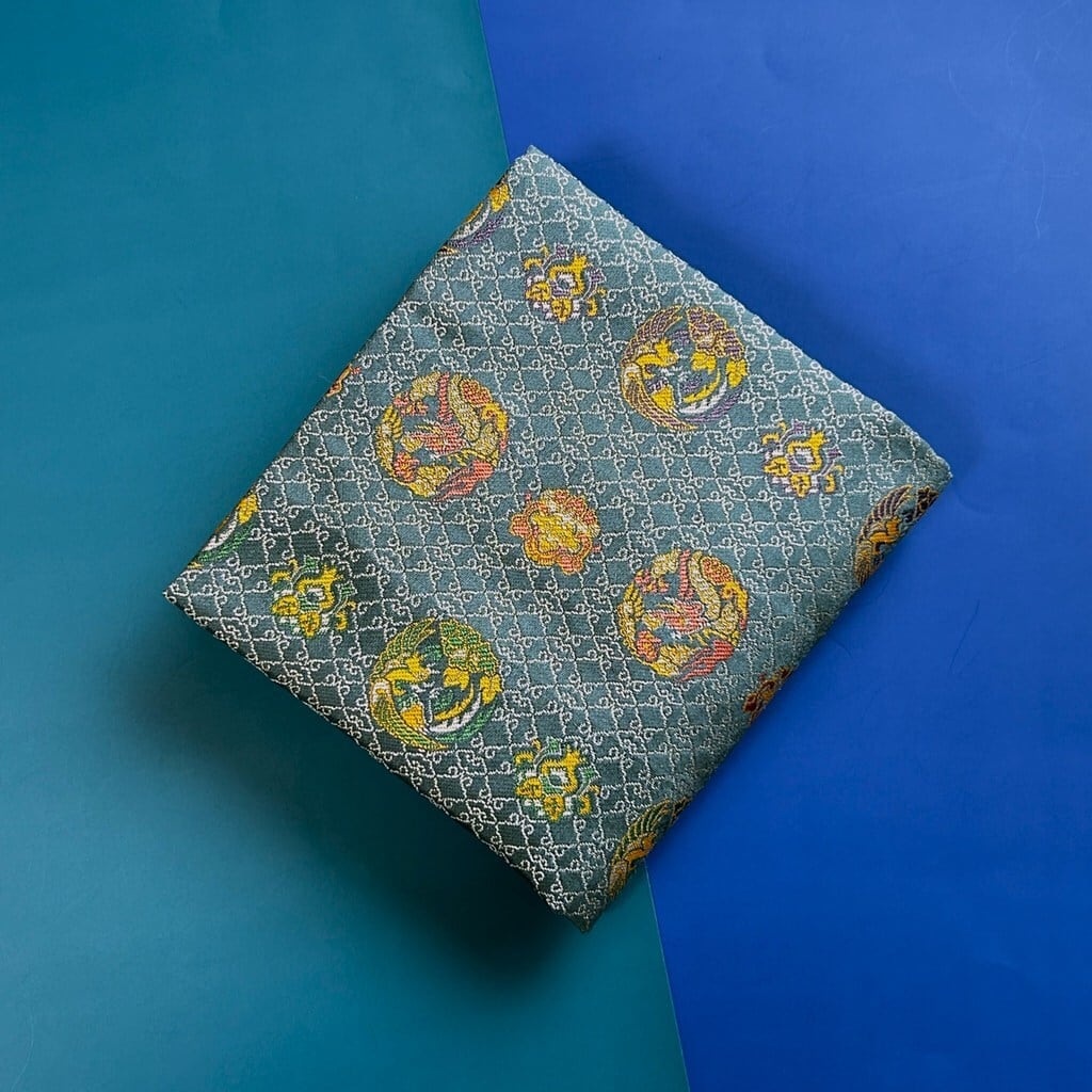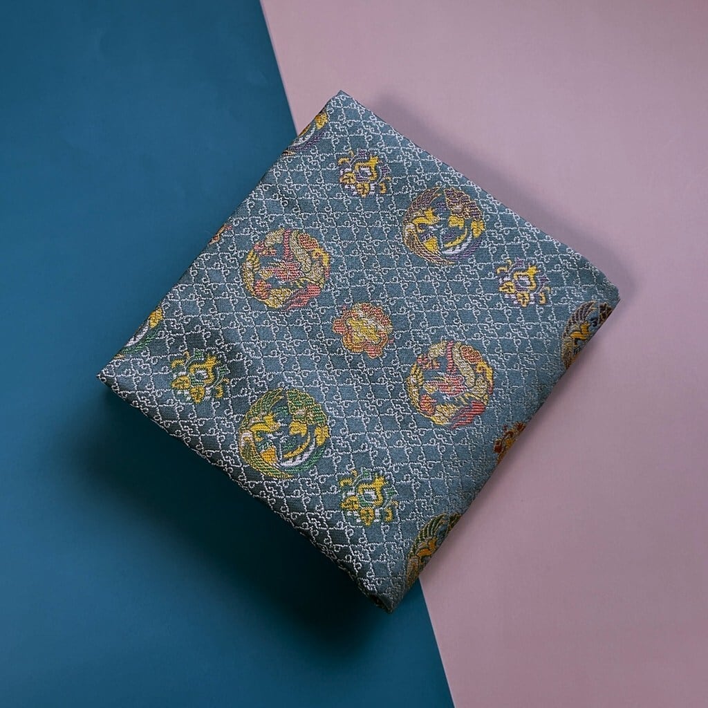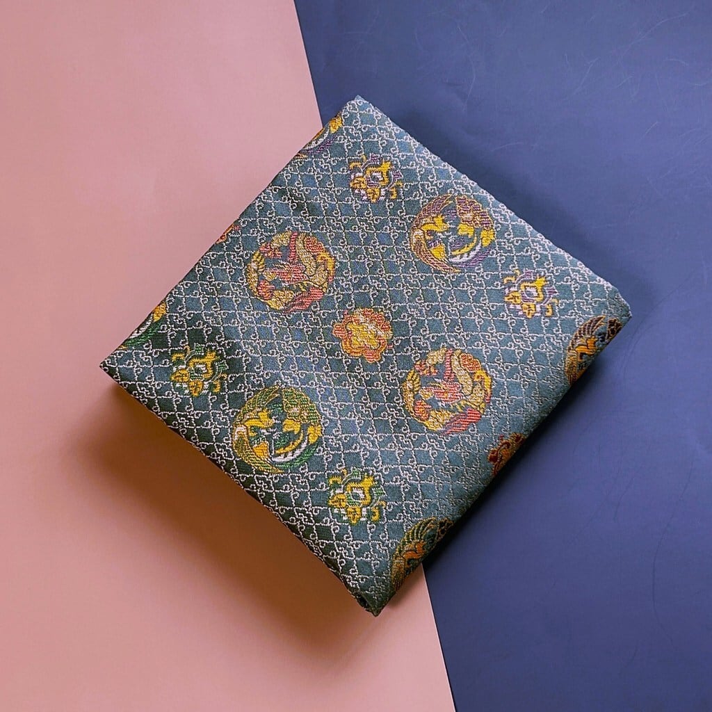 文様は、瑞祥の意味がある雲文様を菱形に構成し、その上に中国で四霊といわれる龍文様と鳳凰文様をあらわしています。見る角度により織り込まれた金箔が浮き出て、文様に重厚な趣を与えています。青みを帯びたグレーで落ち着いた灰青色地です。