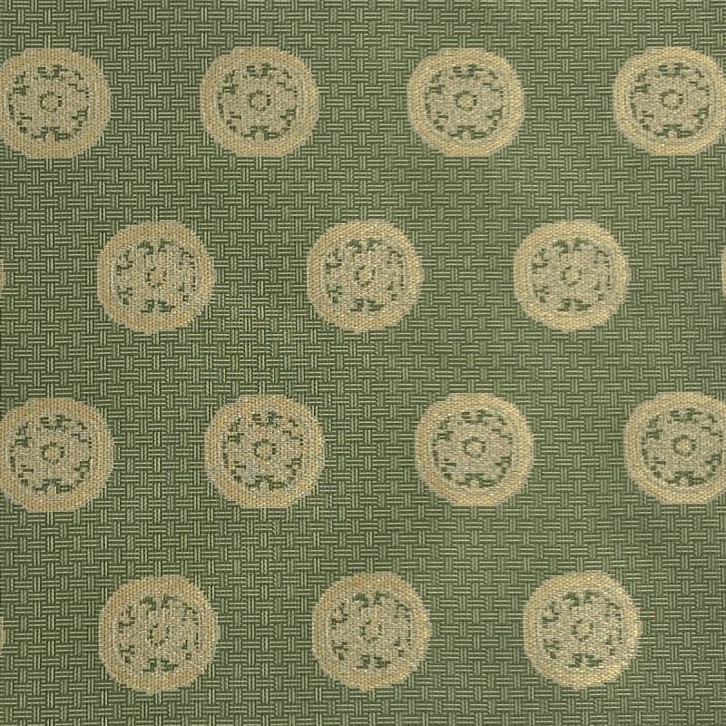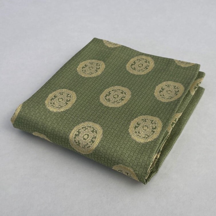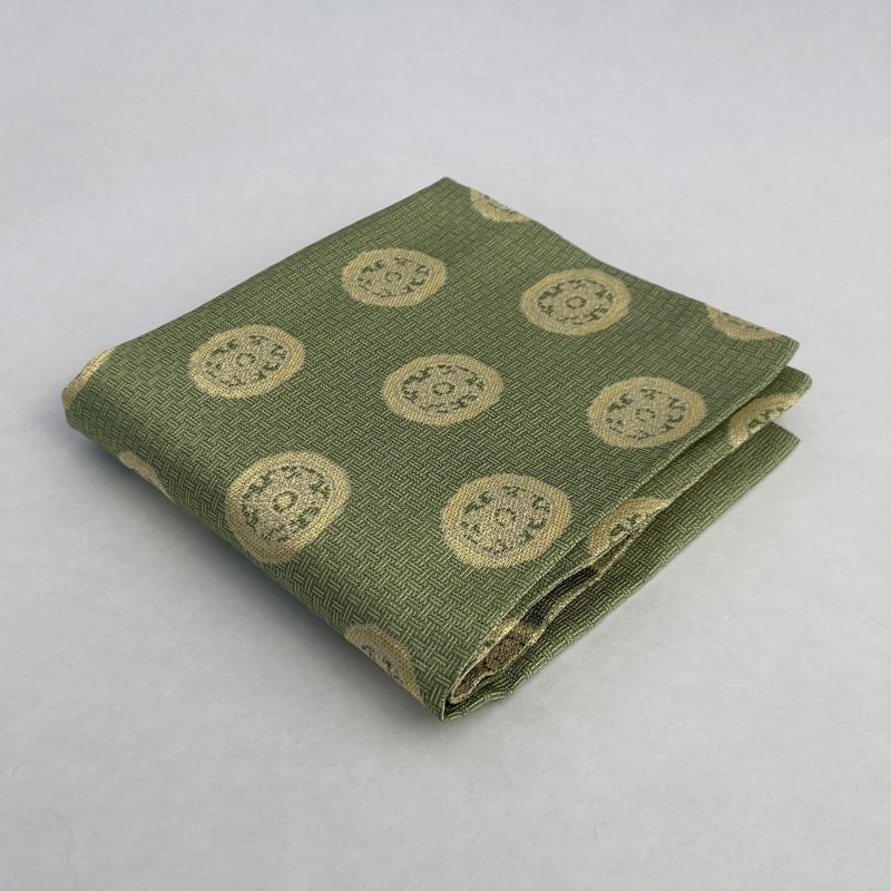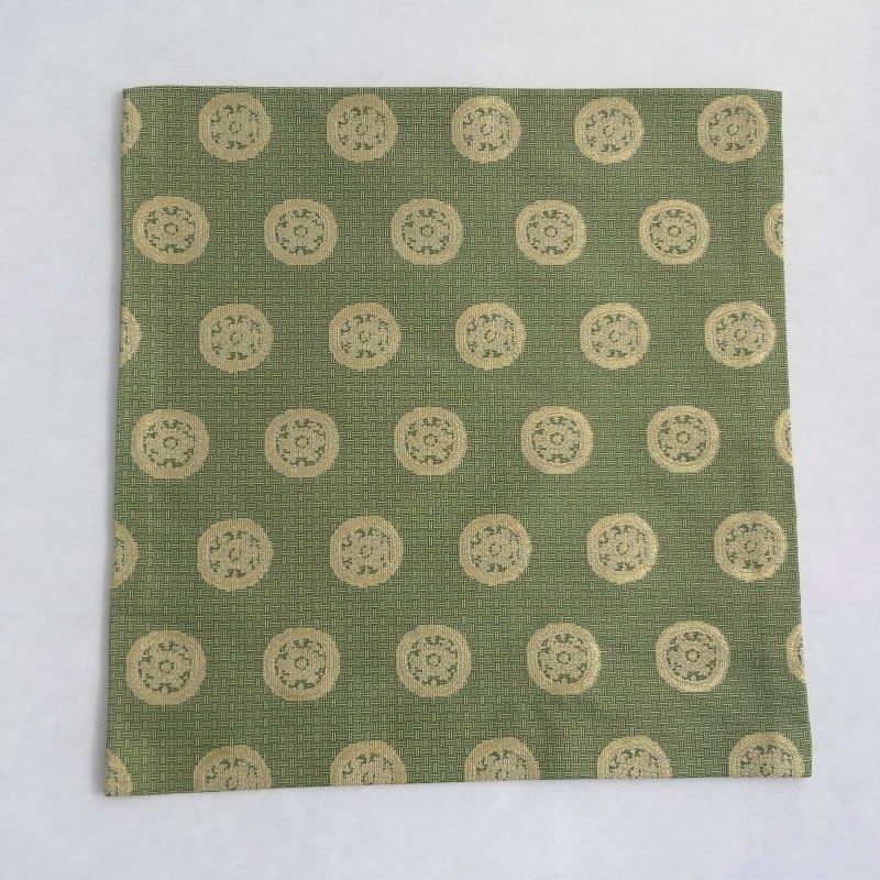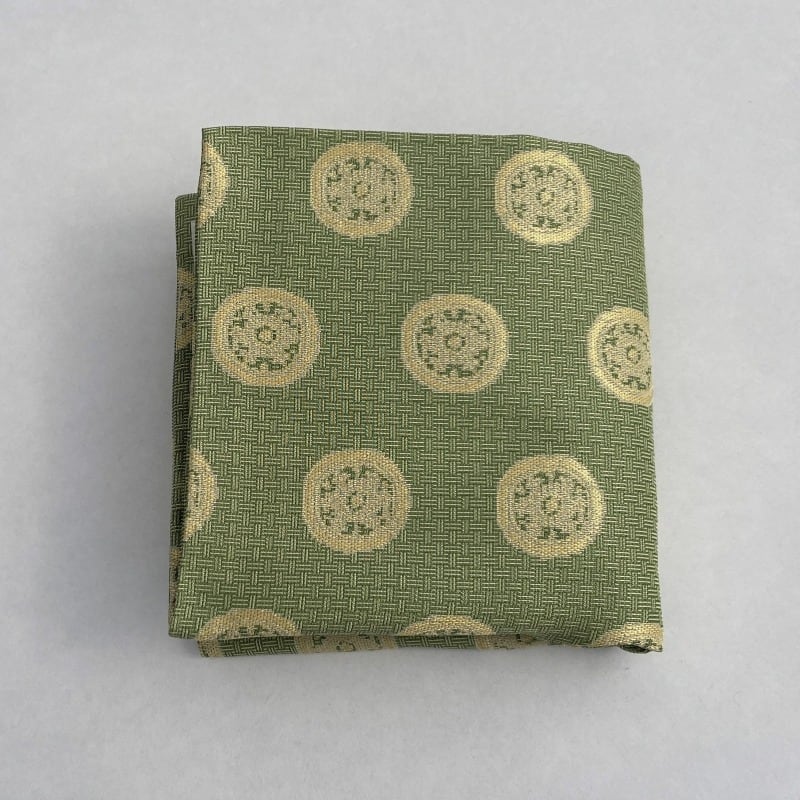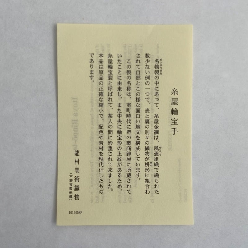 この裂の名称は、室町時代に堺の豪商絲屋に所蔵されていたことに由来し、また中央に輪宝形の上紋があるため、糸屋輪宝裂と呼ばれ茶人の間に珍重されてきました。風通組織で織られ、表と裏の別々の織物が桝形に組み合わされて自然とこの様な面白い地文を構成しています。本品は原品の正確な縮小で、配色や素材を現代化し織り成されています。