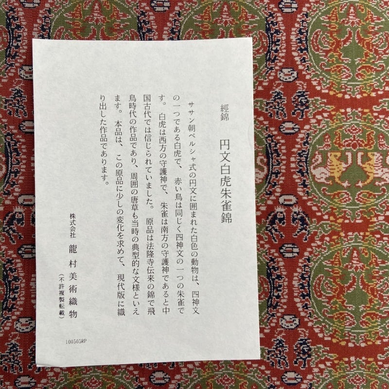 原品は法隆寺伝来の錦で飛鳥時代の作品であり、周囲の唐草も当時の典型的な文様といえます。
