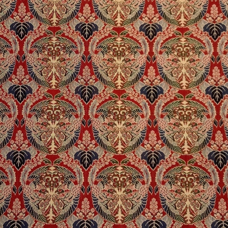 鳳凰を向かいあわせて丸文にし桐花をその四方におき立湧式の中に配した裂で、京都・壬生寺の狂言衣装に使用されていた壬生寺裂の一つであります。[龍村美術織物より]