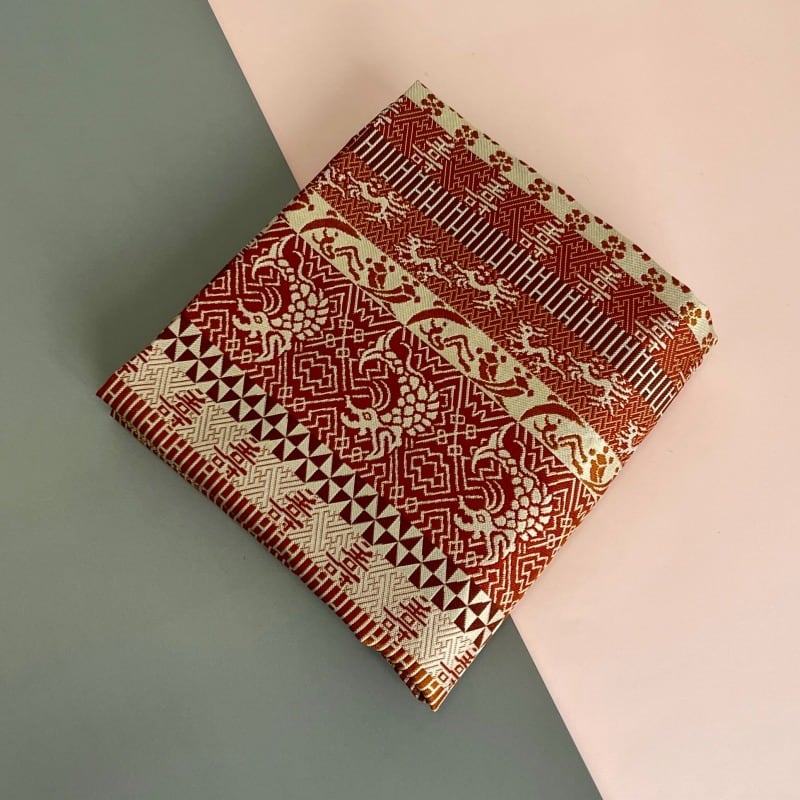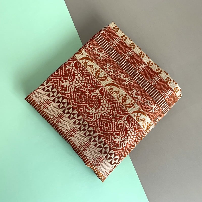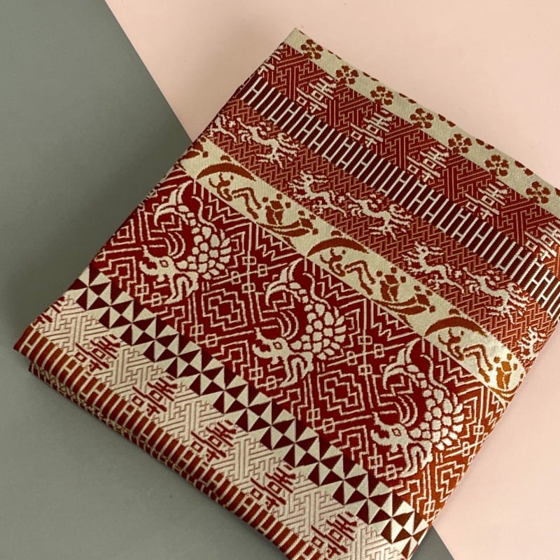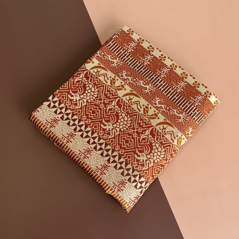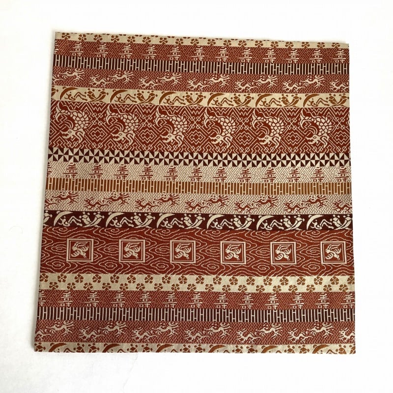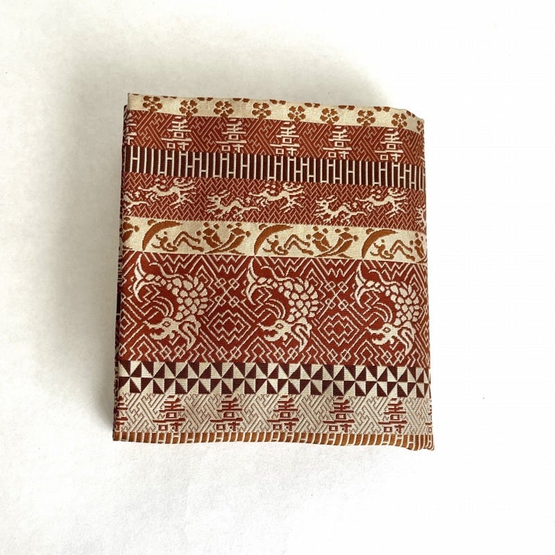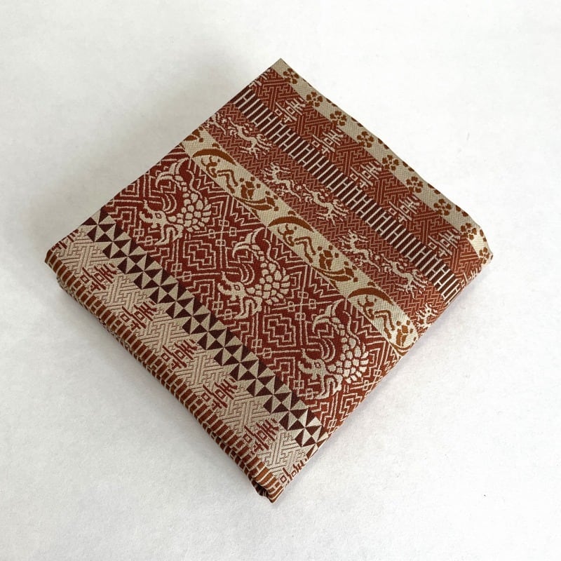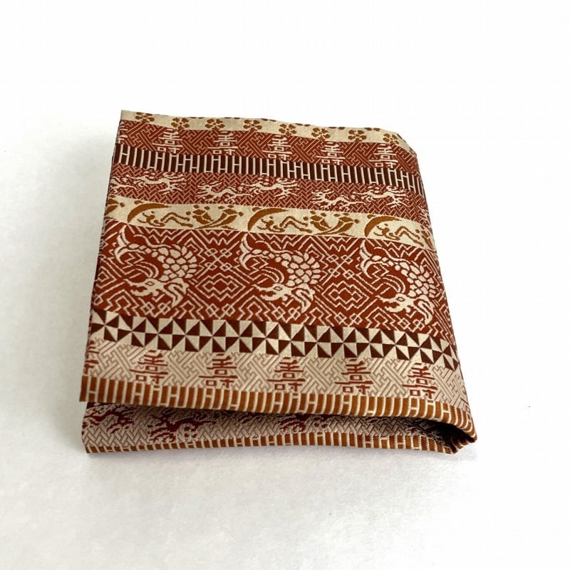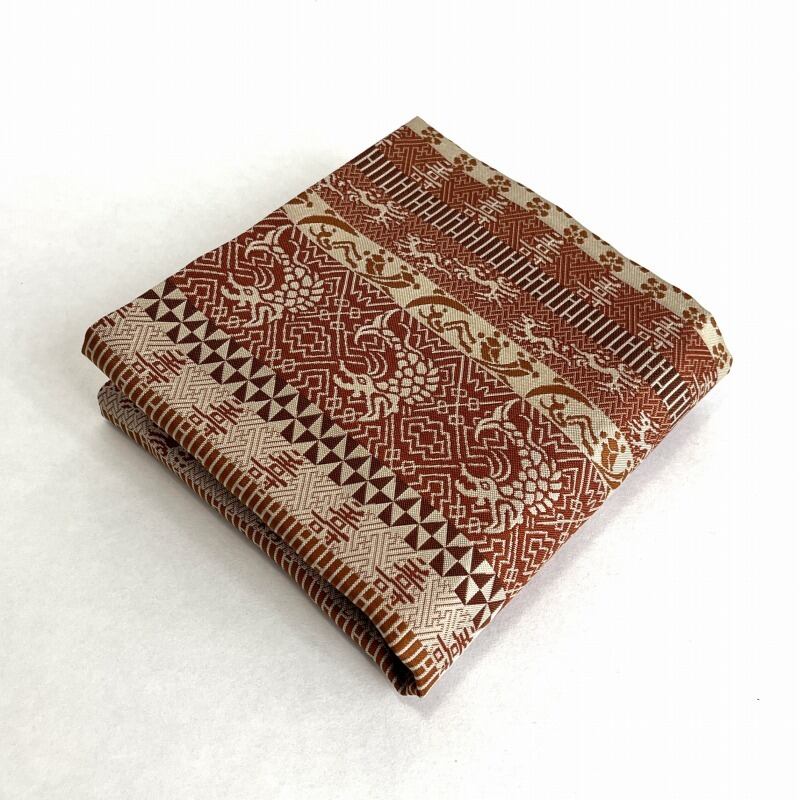 薄茶・茶・海老茶など茶系で段をとり、落ち着いた重厚感のある裂です。